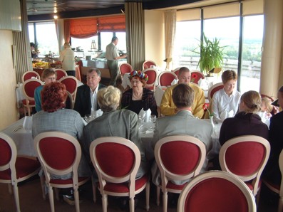 Kuvassa olemme asettuneet juhlalounaspöytään Ravintola Haikaranpesässä, joka sijaitsee korkealla vesitornin huipussa Espoon Haukilahdessa. Ilmapiiri oli miellyttävä ja suosiollinen sää paljasti mahtavat maisemat avomerelle asti.